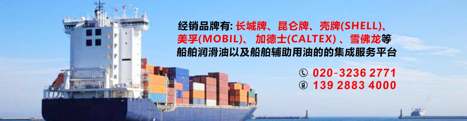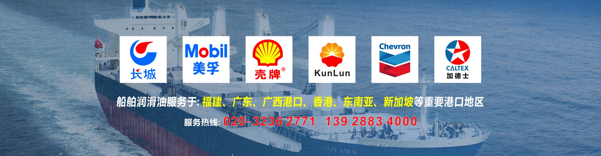 公司代理中石化長城潤滑油以及中石化國際品牌SINOPEC潤滑油,經銷品牌有昆侖牌、殼牌(SHELL)、美孚(MOBIL)、加德士(CALTEX)雪佛龍(CHEVRON)是船舶潤滑油以及船舶輔助用油的的集成服務平臺,也可按照船東要求提供船舶消防救生用品、勞保用品、五金燈具及甲板用品等船舶配套產品。